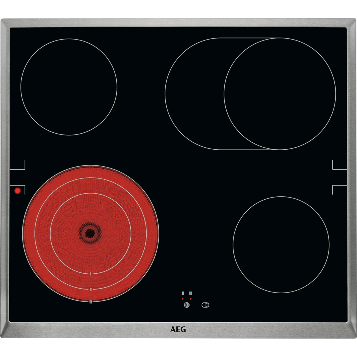 - 4 Stufenlos regelbare Kochzonen mit Zweikreis und Bräterzone